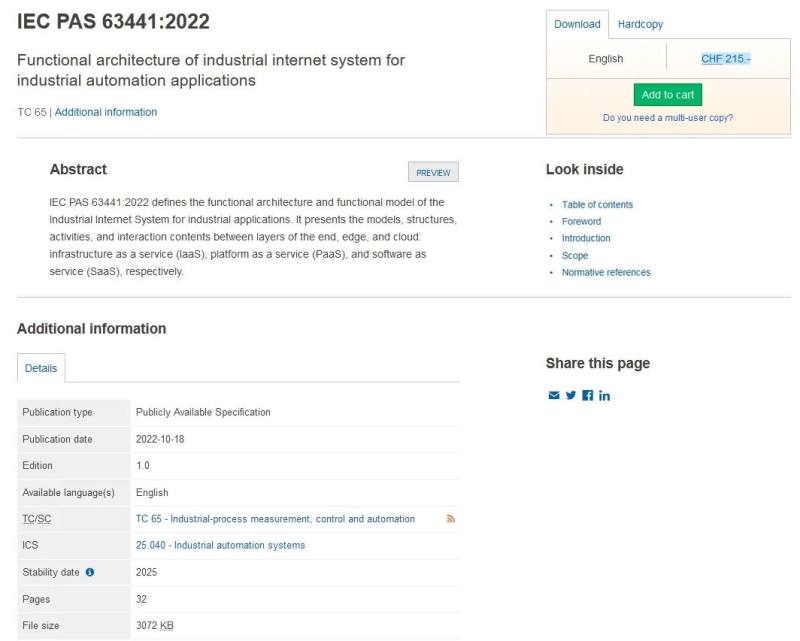 10 月 18 日,国际电工委员会(IEC)官网公布,由卡奥斯 COSMOPlat 联合机械工业仪器仪表综合技术经济研究所(以下简称“仪综所”)牵头制定的全球首个工业互联网系统功能架构国际标准IEC PAS 63441《Functional Architecture of Industrial Internet System for industrial Automation Applications》正式发布。该标准首次对工业互联网系统的端边云架构进行了官方定义。