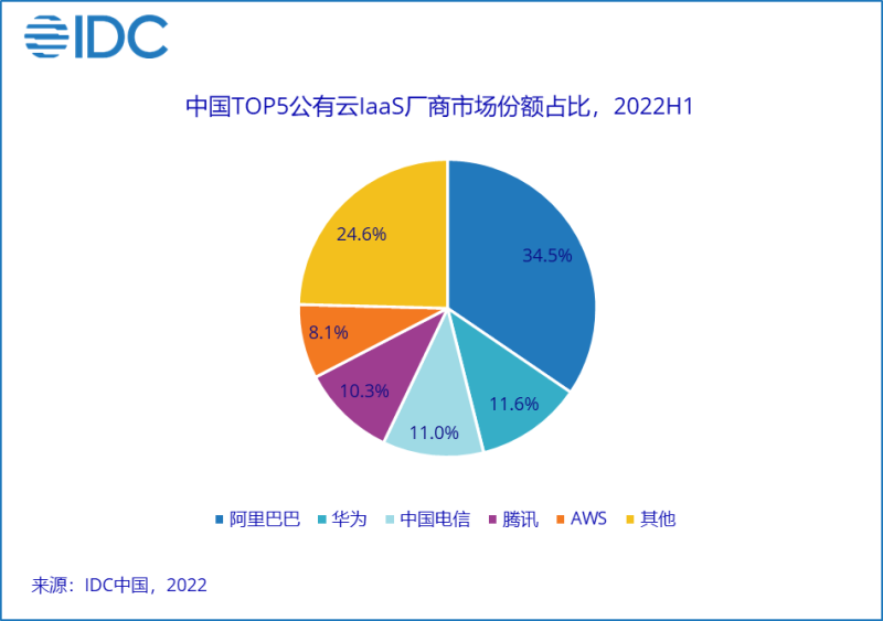 从厂商份额看,在IaaS市场,阿里云、华为云、天翼云、腾讯云、AWS份额分别为34.5%、11.6%、11.0%、10.3%、8.1%。