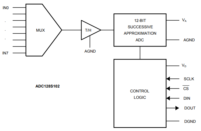 ADC128S102 器件是一款低功耗、八通道 CMOS 12 位模数转换器,适用于 50 kSPS 至 1 MSPS 的转换吞吐率。该ADC12030CIWM转换器基于具有内部采样保持电路的逐次逼近寄存器架构。该器件可配置为在输入 IN0 至 IN7 处接受多达 8 个输入信号。
