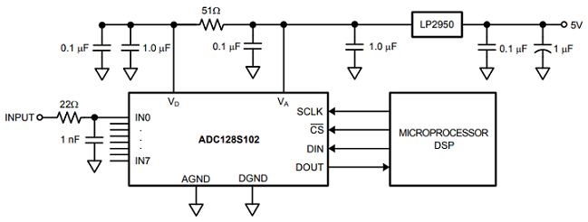 ADC128S102 可以使用独立的模拟和数字电源供电。模拟电源 (V A ) 的范围为 2.7 V 至 5.25 V,数字电源 (V D ) 的范围为 2.7 V 至 V A。使用 3V 或 5V 电源的正常功耗分别为 2.3 mW 和 10.7 mW。断电功能可将使用 3V 电源的功耗降低至 0.06 μW,使用 5V 电源可将功耗降低至 0.25 μW。