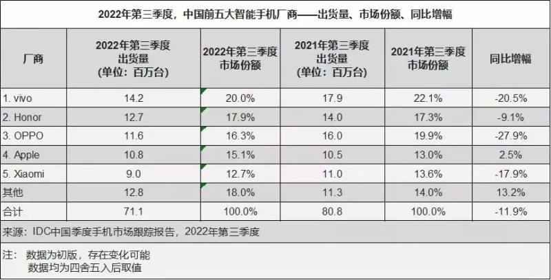 苹果2022年第三季度在中国智能手机市场出货量1160万台,同比增长2.5%,市场份额15.1%排名第四。苹果本季度的排名上升一位,也是TOP5中唯一保持同比增长的厂商。