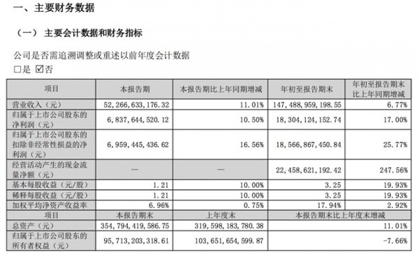 归属于上市公司股东的净利润为68.38亿元,同比增长10.5%;扣除非经常性损益的净利润为69.59亿元,同比增长16.56%。