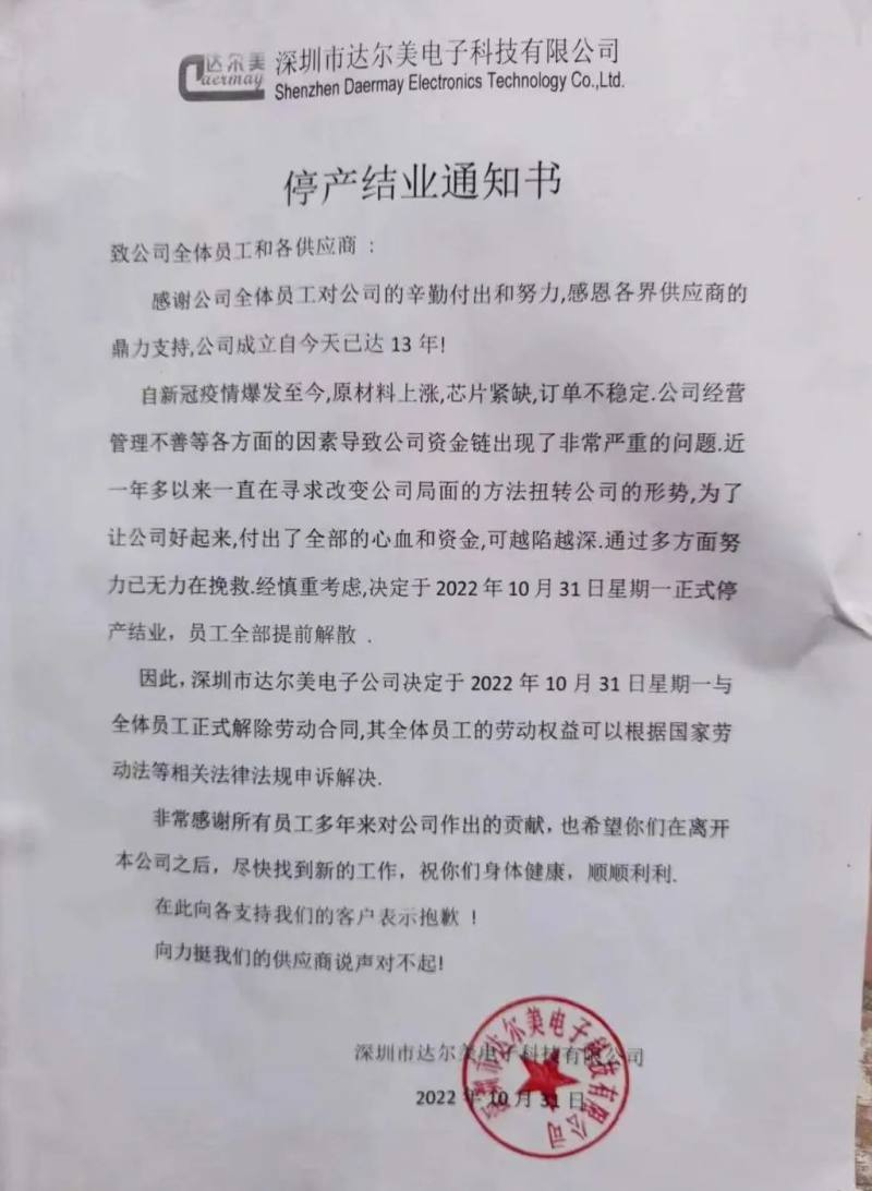 根据读者提供的停产结业通知书可知,困扰业界已久的原材料上涨,芯片紧缺,以及该公司订单不稳定及经营管理不善等问题造成资金链出现严重问题,是这家13年老厂决定停产结业的原因。l9Mesmc