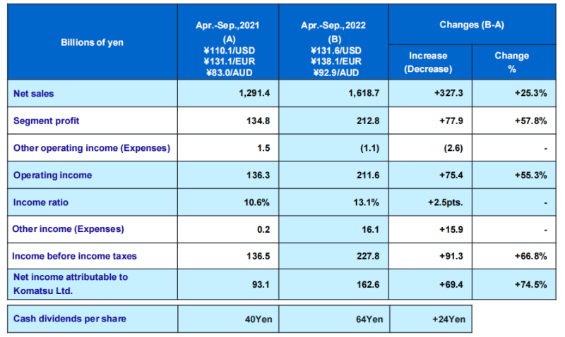 2022年4-9月(2022财年前六个月)小松合并经营业绩