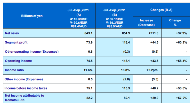 2022年7-9月(2022财年第二季度)小松合并经营业绩