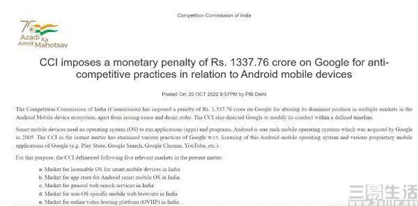 最近这段时间,印度监管机构又开始频频针对海外厂商,包括谷歌这样的跨国巨头也未能幸免。日前,印度竞争委员会(CCI)方面宣布,对谷歌处以133.8亿印度卢比(约合1.615亿美元)的罚款,原因是其滥用在Android移动设备生态系统中多个市场的主导地位,并责令谷歌改正行为、开放Android生态系统进行竞争。
