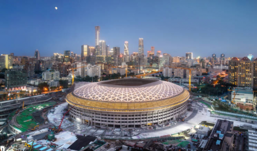 2022年10月15日,随着夜幕降临,新工人体育场罩棚灯光首次完整亮相。华灯初上,椭圆形的新工体罩棚第一次“亮”出完整轮廓,保持“传统外观”的外立面在灯光的映衬下愈发庄重典雅。