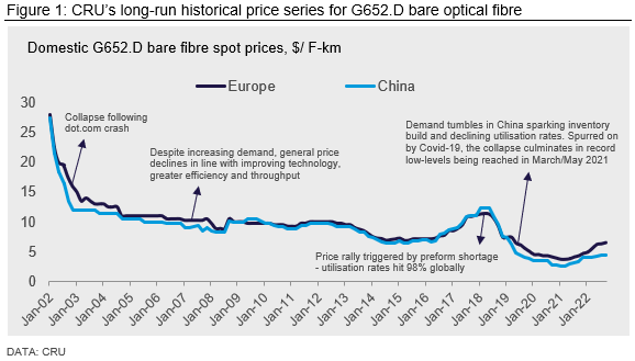 CRU首先回顾了过去20多年追踪裸光纤价格的历史趋势。如下图所示,从2002年开始,裸光纤价格已从28美元/芯公里大幅下降到现在的4-6美元/芯公里。