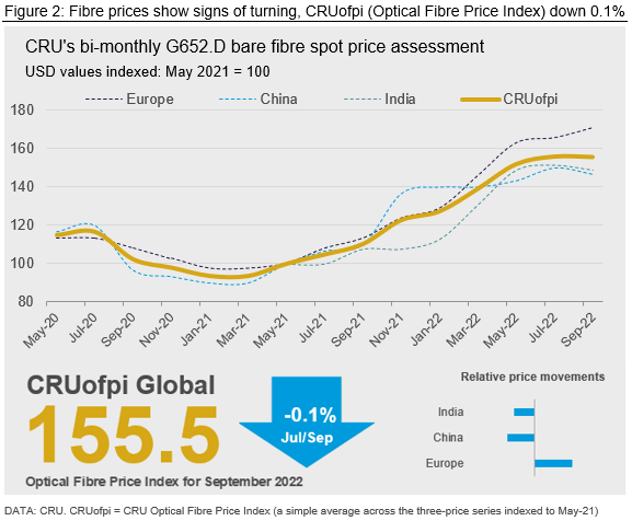 CRU指出,事实上,中国国内现货价格已停止增长,而印度的现货价格已回落了5卢比每芯公里。考虑到汇率的波动,一旦转换成美元,中国和印度这两个价格系列每芯公里还要再减去0.10美元,由此导致CRU光纤价格指数(CRUofpi)自2021年3月以来首次下降--虽然降幅只有0.1%。从初步评估来看,过去18个月来主导市场的裸光纤价格涨势似乎正在失去动力。
