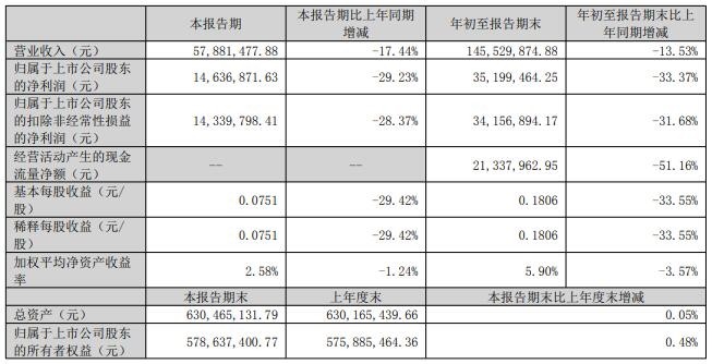 报告期内公司2022年前三季度营业收入为145,529,874.88元,比上年同期下滑13.53%;主要系订单减少所致。归属于上市公司股东的净利润为35,199,464.25元,比上年同期下滑33.37%,主要系收入减少所致。