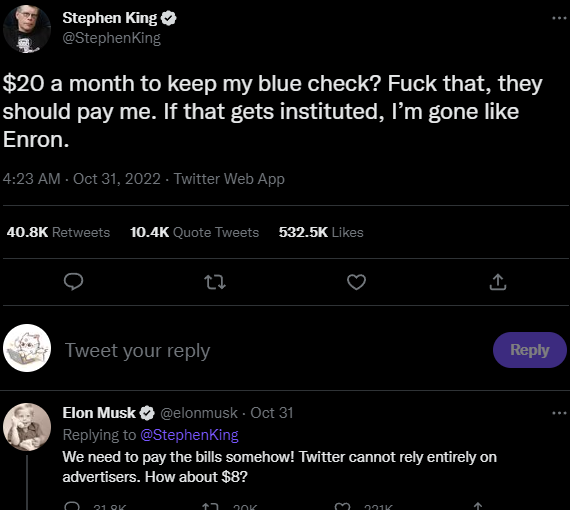 问题是在付费项目推进上面,马斯克的进展也相当不好。之前本来说要每个月20刀,结果被知名作家史蒂芬·金狂喷,把价格改成了每月$8。