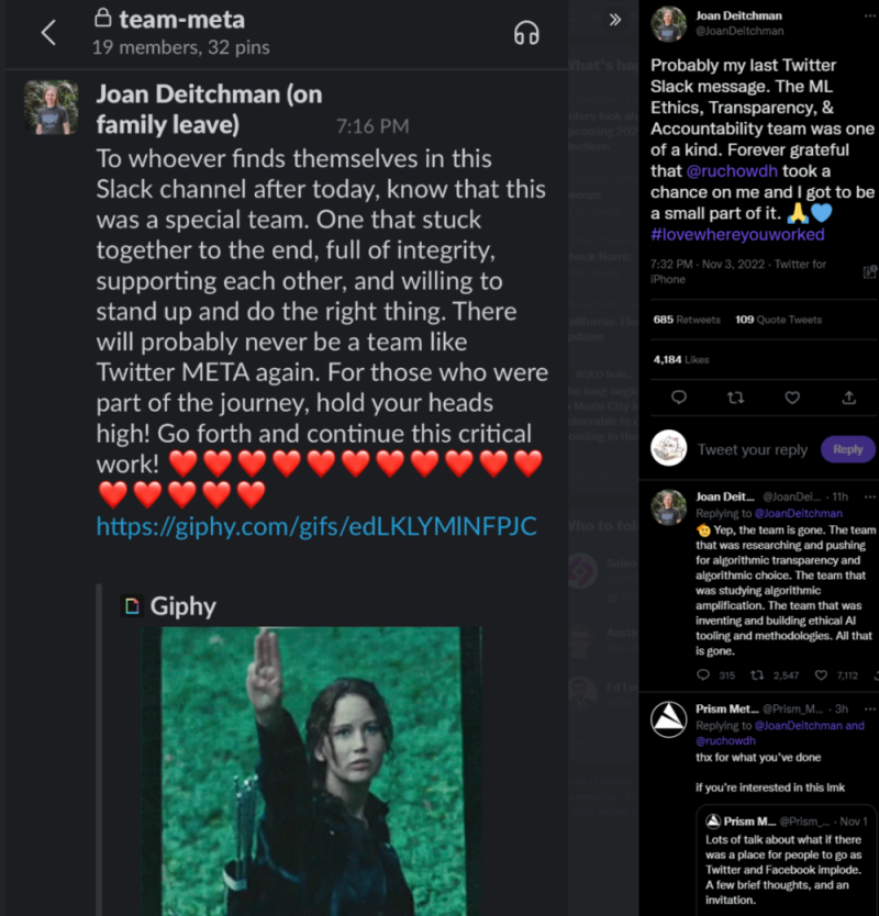 Deitchman 的团队名为 META,从事的是 Twitter 平台算法提高透明度方面的研究。这个团队正在研究平台上假消息为何更多被算法增幅的问题,并且开发能够帮助公司员工和用户的方法和工具——遗憾的是在本次裁员中,这个团队被一锅端了。