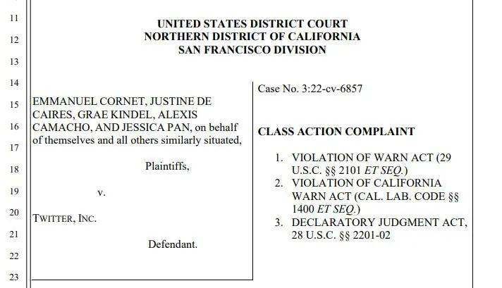 这起诉讼的五位员工,Cornet、De Caires、Kindel、Camacho 和 Pan,都是在本周二(11月1日)和周四当天(11月3日)被解雇的。诉状中指出,Twitter 对这些员工的解雇流程,都没有提前60天提供书面通知,也即违反了联邦和加州的 WARN 法案,并且也没有告知任何关于遣散补偿的消息。