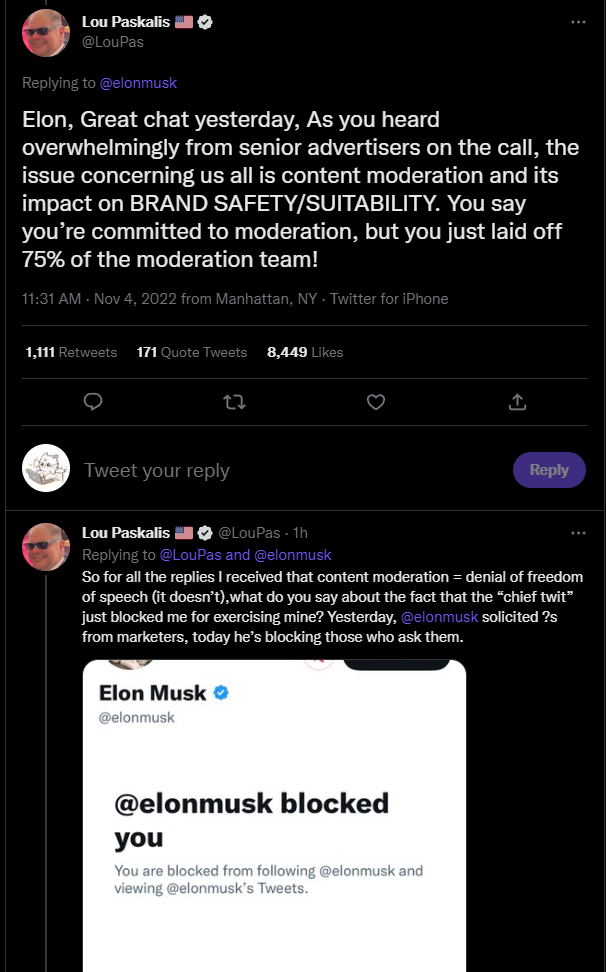 还有这么一位广告业高管,称马斯克召集了他和其他一些广告顾问开会,结果会后马斯克裁员的行为和他的承诺背道而驰,就马上被马斯克拉黑了。