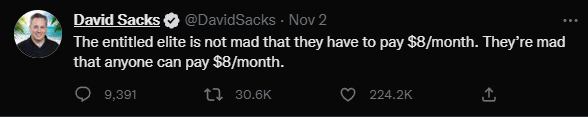 下面这条推文来自 David Sacks。他是一位投资人、PayPal 黑帮成员、播客创作者,同时也因为跟马斯克的亲密关系而进入了 Twitter 的 “战时指挥室”(war room),是目前公司内部发号施令的高管之一。(尽管有 Twitter 员工透露他在公司里基本就是马斯克的跟屁虫,马斯克走到哪他走到哪,马斯克站着他绝不坐下。)