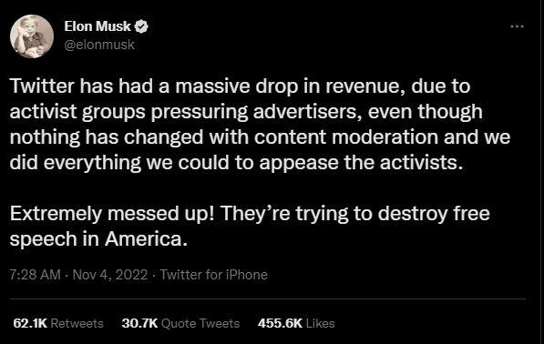 “由于激进团体向广告商施压,Twitter的收入大幅下降,尽管内容审核没有任何变化,我们也尽了一切努力来安抚激进分子。极度混乱!他们正试图破坏美国的言论自由。”