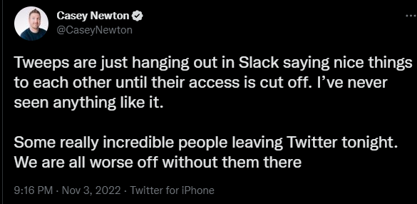 员工原本还在用公司规定的内部通讯软件 Slack,然而发现马斯克及其手下在接管公司之后很快就开始监控 Slack 频道,于是大家转而使用各种非官方 IM 软件(如 TG、Signal 等)以及匿名职场社交平台 Blind 上面交换信息。