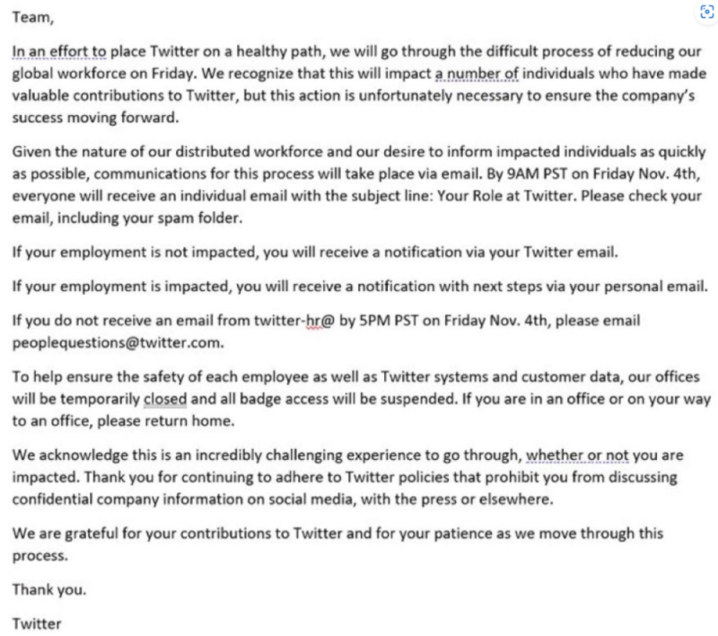 没错,直到这封邮件之前,马斯克未曾对公司员工做出过任何公开、正式、全体的沟通——员工心里明白此人来者不善,但没想到接管公司一周之后的第一次收到来自马斯克的正式沟通,竟然就是裁员……而且在很多人看来,这封信写得相当无情。