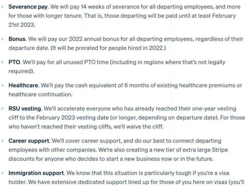 相比之下,另一家最近裁员的公司,就在通知邮件里将遣散补偿、bonus、未使用假期、医保、股票解禁、移民签证支持等各种可能发生的问题,全部都列了出来,高下立判(下图)。