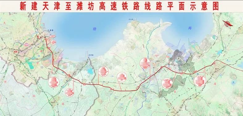 津潍高铁位于津冀鲁两省一市环渤海地区,起自天津枢纽滨海站,终到济青高铁潍坊北站,正线长度 348.2 公里,其中桥梁长度 322 公里,隧道 6.7 公里,桥隧比 94% 。全线共设车站 10 座,在滨海西设动车所 1 座,在东营南、潍坊北各设存车场 1 座,同时修建本线与津秦高铁、京滨铁路、济青高铁联络线工程。