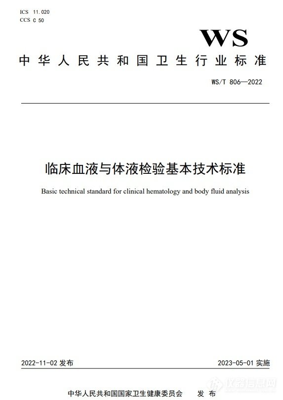 其中【WS/T 806—2022 临床血液与体液检验基本技术标准】规定了医学实验室在临床血液与体液检验领域的基本技术要求,包括血液一般检验、血栓与 止血检验、流式细胞分析、体液检验常用检测项目的基本技术要求。 该标准适用于开展血液与体液检验的医学实验室。