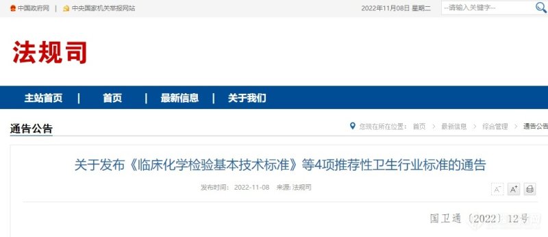现发布《临床化学检验基本技术标准》等4项推荐性卫生行业标准,编号和名称如下: