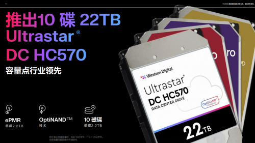 在HDD领域,西部数据通过独特的面密度优势,帮助云服务商进一步降低总体拥有成本,带来更多优势,推动云服务稳步发展。2021年,西部数据通过将行业领先的NAND闪存与世界一流的HDD产品进行垂直整合,开发出用于闪存增强型硬盘的OptiNAND技术。今年,西部数据发布了基于OptiNAND技术的22TB Ultrastar DC HC570 CMR HDD,在成熟的单碟2.2TB的氦气封装技术上实现了10碟更高的面密度。