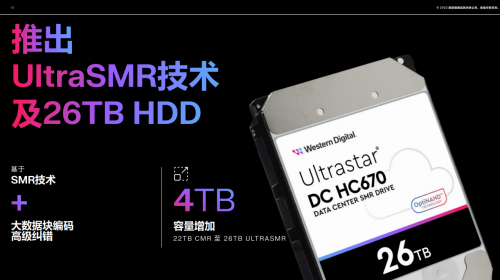 此外,西部数据还推出UltraSMR技术并发布了26TB Ultrastar DC HC670 UltraSMR HDD。UltraSMR引入了大数据块编码和先进的纠错算法,增加了每英寸磁道数(TPI),以实现更高的容量。26TB Ultrastar DC HC670 UltraSMR HDD可提供单碟 2.6TB 的容量,为云服务提供商优化其堆栈来实现SMR技术优势,带来了约18%的容量提升。