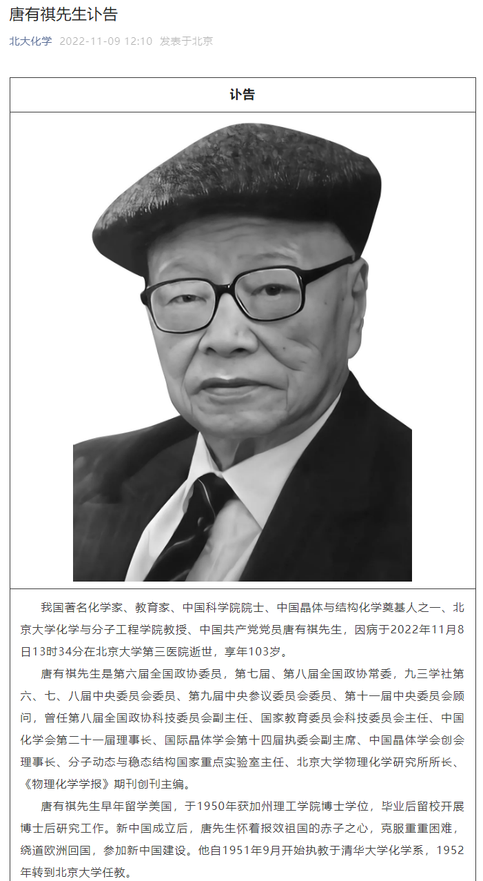 IT之家 11 月 9 日消息,据北大化学公众号,我国著名化学家、教育家、中国科学院院士、中国晶体与结构化学奠基人之一、北京大学化学与分子工程学院教授唐有祺先生,因病于 2022 年 11 月 8 日 13 时 34 分在北京大学第三医院逝世,享年 103 岁。