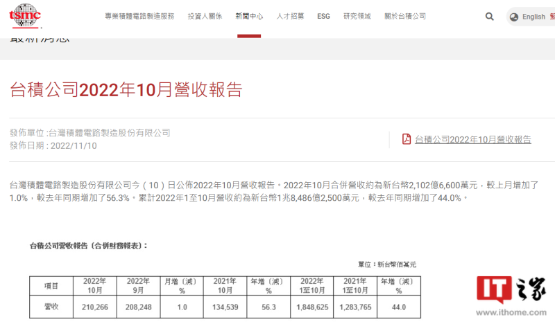11 月 10 日消息,台积电今日发布了 2022 年 10 月营收报告。10 月合并营收约为 2102.66 亿元新台币(约 479.41 亿元人民币),较上月增加了 1.0%,较去年同期增加了 56.3%。