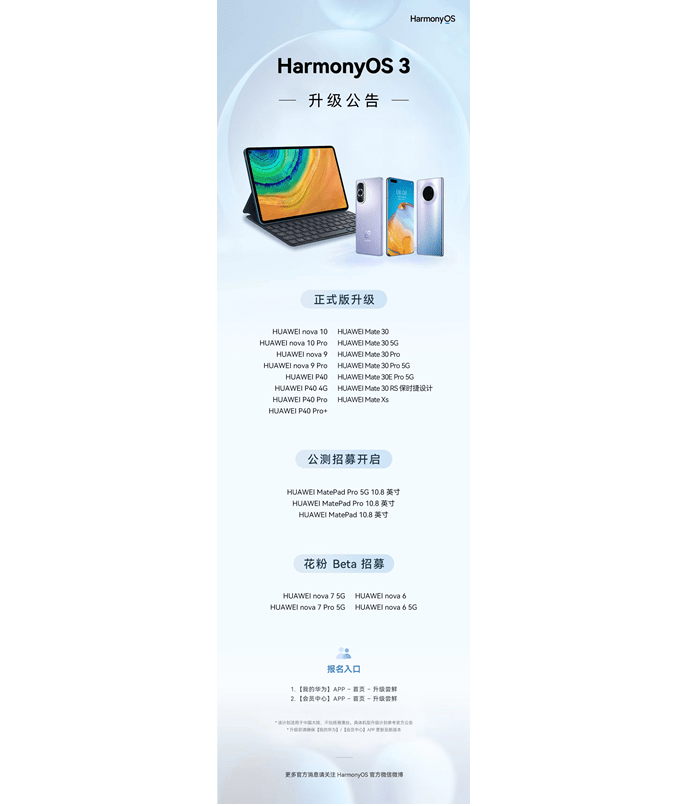 如果你是手持Mate 30、P40、Mate Xs等15款机型的朋友,不要犹豫,现在就进入【我的华为】APP-首页-升级尝鲜,更新体验吧!更多HarmonyOS 3升级和玩机资讯,可以持续关注HarmonyOS官方微信微博。