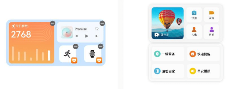 针对尺寸各异的万能卡片,卡片夹拥有同尺寸卡片可堆叠、不同尺寸卡片可自由组合的贴心功能,不仅会让桌面看起来更清爽,日常用机的操作效率也能大大提升。升级之后,通过简单的长按、拖拉,我们就可以将天气、图库、日历、备忘录等卡片通通堆叠在一起。或者根据运动、学习、新闻资讯、疫情出行等场景需求自由组合大小不一的卡片,比如把课程表、备忘录和日历拼装成一个学习卡片;组合运动健康、步数和音乐卡片成一张运动卡片,一卡满足运动场景下的各种需求。