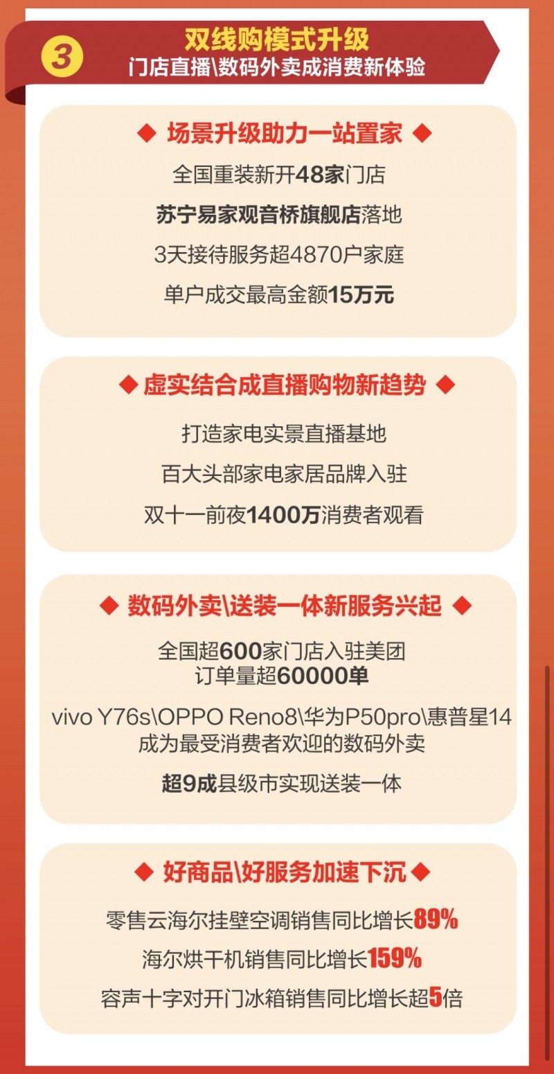 双十一期间,苏宁易购在全国重装新开了48家门店,持续提升门店场景、提案和服务能力。其中,11月4日,苏宁易家首个旗舰店落地重庆观音桥,开业3天,整体业态较升级前销售规模同比增长247%,新业态助力“一站置家”消费方式加速普及,该店“全程导购”3天接待并服务了超4870户家庭,全屋定制订单占比35%,单户成交最高金额15万元。