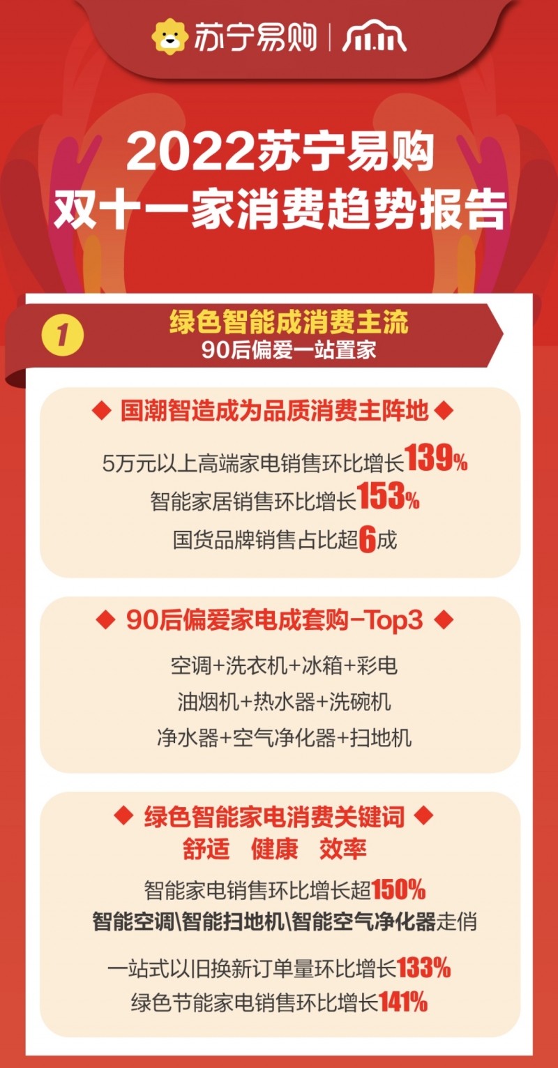 11月11日,苏宁易购发布《2022双十一家消费趋势报告》显示,今年双十一苏宁易购发力“一站式家庭场景解决方案”,家电、家装消费主场优势持续巩固,线下绿色节能家电销售环比增长141%,智能家居产品销售环比提升153%,全屋定制订单环比提升186%,中央集成家电销售环比增长113%。新理念、新产品、新体验成为驱动双十一“家消费”升级的“三驾马车”。