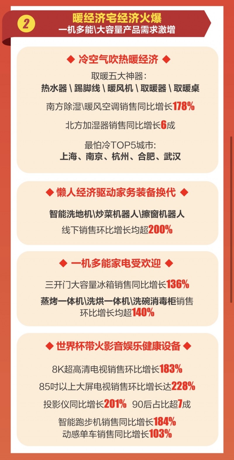 双十一期间,受冬季保暖、宅家娱乐、生活品质提升等多重需求拉动,家电消费领域“网红”“爆款”产品频出,新趋势商品成为提升生活幸福感的利器,逐步展现出强劲的消费张力。
