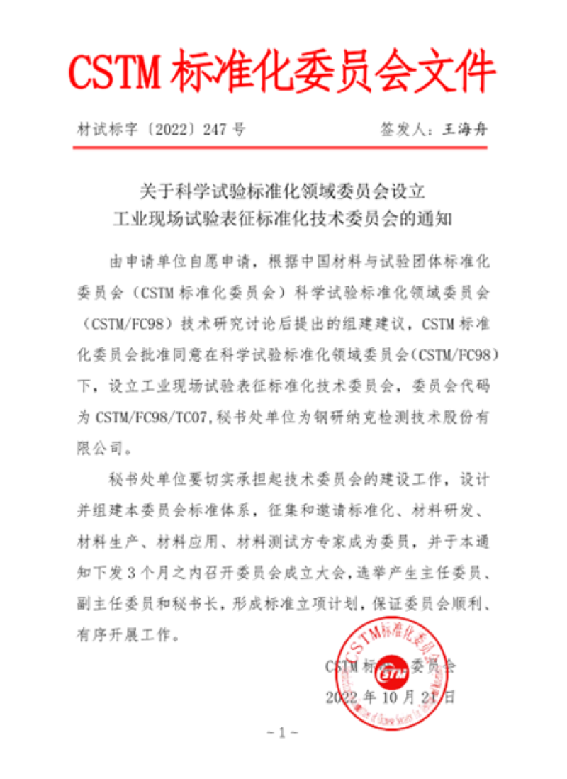 【仪表网 仪表产业】10月21日,CSTM标准化委员会批复同意在CSTM FC98 科学试验标准化领域委员会下成立TC07工业现场试验表征标准化技术委员会,秘书处设置在钢研纳克检测技术股份有限公司。