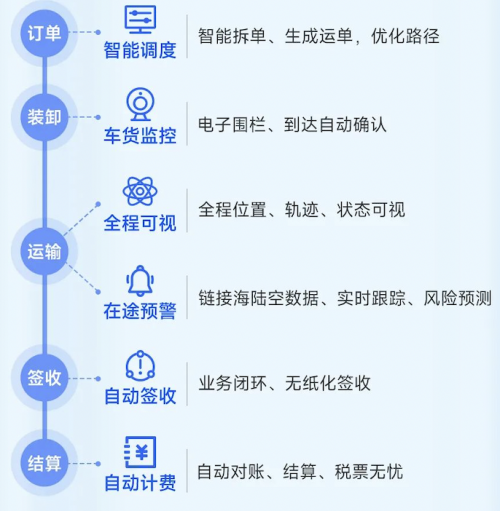 经过一系列的方案制定,软件支持与企业本身的硬件搭配,最终可实现如下从订单、装卸、运输、签收到结算,五步骤完善的的管理流程,实现企业数字化安全管理与降本增效的双目标。