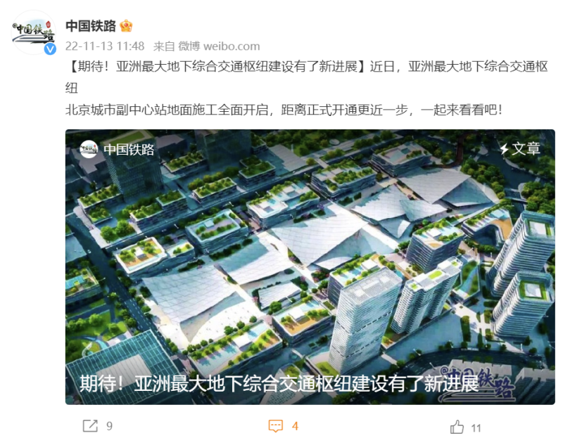 IT之家 11 月 13 日消息,据中国铁路官微,亚洲最大地下综合交通枢纽“北京城市副中心站”建设有了新进展,地面施工近日全面开启,距离正式开通更近一步。