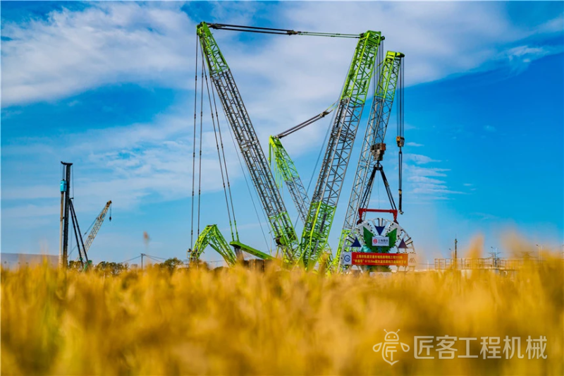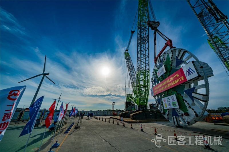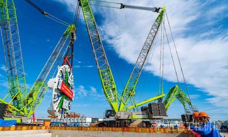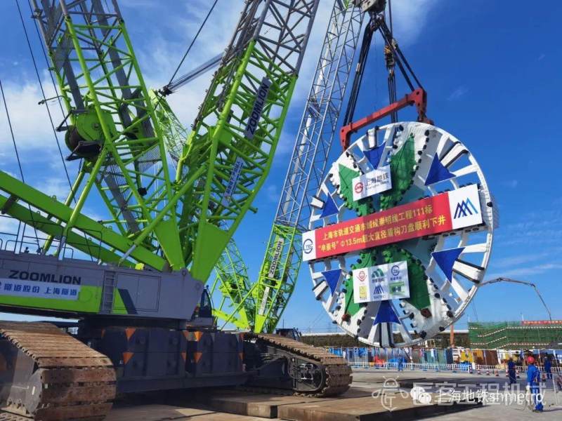 “申崇号”盾构机刀盘直径13.5米,重量达到309吨,总长148米,为泥水气平衡盾构。采用常压刀盘设计,整机10bar压强耐压设计,配置应急避难仓和自动喷淋及水幕系统。为了确保盾构机能顺利下井,项目部选择使用两台中联重科履带吊设备同步施工,协同作业。