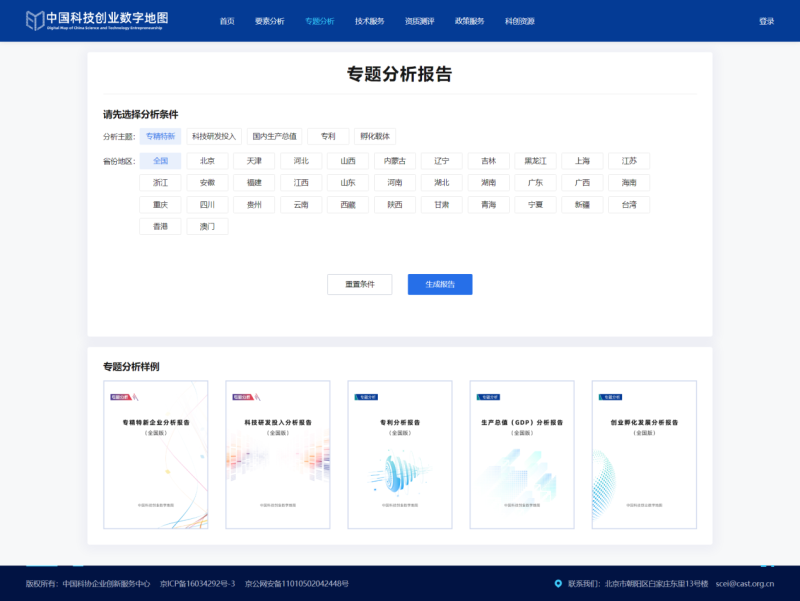 “专题分析”是科创数字地图3.0版打造的特色服务之一。为帮助各类用户群体更好地了解相关领域的整体发展情况,数字地图基于数据图谱,提供了包括专精特新、科技研发投入、生产总值、专利、孵化载体等专题分析服务。用户可通过领域、全国及省份等条件设置,定制相应的分析报告并下载,为相关研究和工作开展提供有价值的分析和参考。