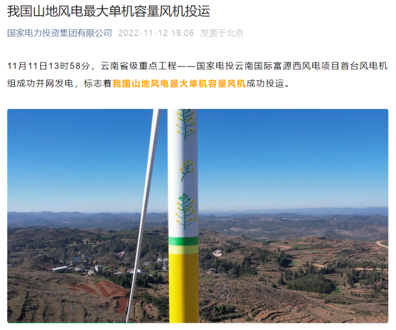 11 月 13 日消息,据国家电力投资集团有限公司消息,11 月 11 日 13 时 58 分,云南省级重点工程 —— 国家电投云南国际富源西风电项目首台风电机组成功并网发电,标志着我国山地风电最大单机容量风机成功投运。