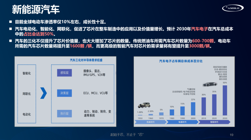 这里以新能源汽车为例做一个简单的展开。新能源汽车分为三个趋向——智能化、电动化及网联化——会大大提升芯片在整车制造中的比重,预计到2030年这个比重会达到50%。另外一个角度,汽车芯片的使用量,从传统汽车600-700颗到现在1600颗,乃至将会提到3000颗每辆。Kk1esmc