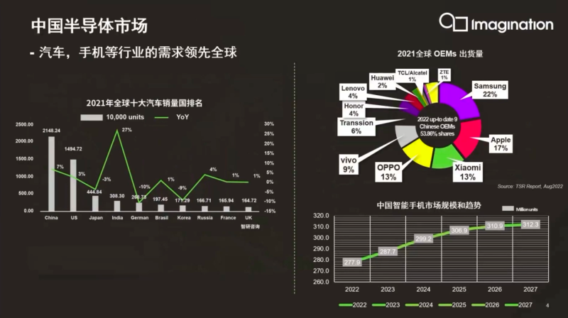 白农特别提到了4个在中国高速发展的市场,分别是汽车、手机、PC和云游戏。这4个市场,实际上也是Imagination当前能够涉足并能够占据一席之地的市场。而且从下游系统厂商的角度,这几个市场的系统级参与者都更有机会自己去开发芯片。这两年EDA、IP供应商普遍在谈这些市场的机遇。