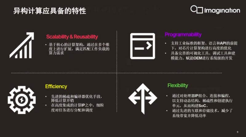 白农提到异构计算的几个重要特性(1)可拓展性与可重用性(scalability & reusability);(2)可编程性;(3)高效性;(4)灵活性。不过其实即便不看Imagination的异构处理器IP布局,其GPU当前的弹性缩放思路似乎也是循着这几个特点在走的。
