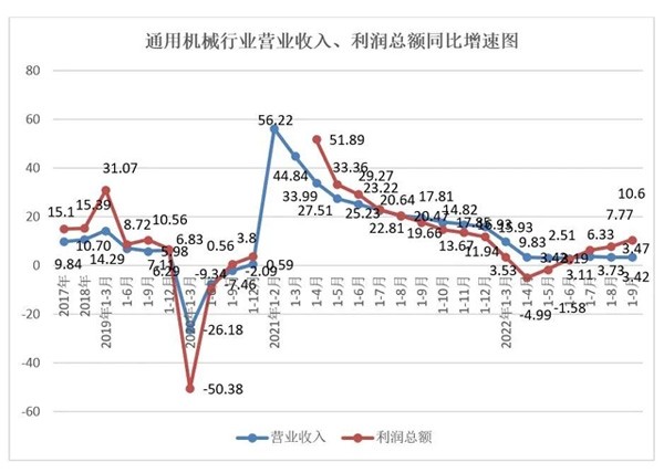 与全国工业相比,1-9月通用机械行业营业收入增速低于全国4.78个百分点,利润总额增速高于全国12.93个百分点。