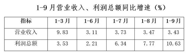 据国家统计局统计数据,1-9月行业实现营业收入7319.73亿元,同比增长3.43%,与上半年相比基本持平;实现利润总额538.91亿元,同比增长10.63%,增速较上半年显著提高;完成出口交货值996.3亿元,同比增长9.3%。