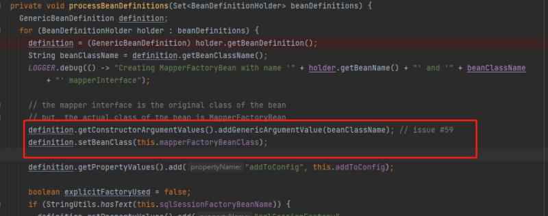 为什么ClassPathMapperScanner能够扫描到带有Mapper注解的类呢?看上面代码,就是通过调用registerFilters方法来添加includeFilter(实际类型是:TypeFilter),这个就是Spring提供的扩展点,让咱们自己来指定需要被扫描的类,这里使用的是MappScan注解中annotationClass属性配置的注解类型,我们这里配置了Mapper,所以调用scan方法开启扫描后,Spring就会将包含Mapper注解的类扫描为BeanDefinition。注意这里的扫描能力还是调用Spring的扫描器来实现的,ClassPathMapperScanner并没有修改,只是当扫描完成后,ClassPathMapperScanner会对扫描出的BeanDefinition进行重新处理,主要是把原来的BeanClass修改成了MapperFactoryBean.class: