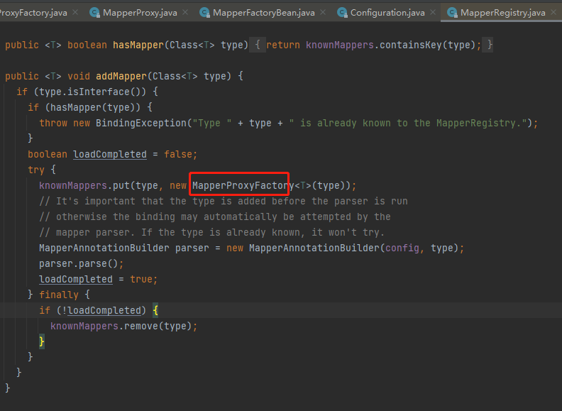 看出门道了吗?其实就是使用Mapper的接口类型作为key,MapperProxyFactory做为value,然后添加到mapperRegistry对象的Map集合中,注意这个type同时也是MapperProxyFactory对象的构造参数哦。