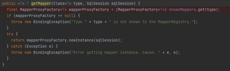 getObject方法中,会调用getMapper方法,该方法中从knowMappers这个Map集合中拿到MapperProxyFactory对象,这个对象不就是我们在准备阶段添加的嘛!它就是用来创建代理对象的工厂。