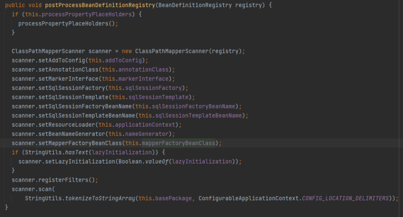 它是BeanDefinitionRegistryPostProcessor的实现类,是一个BeanFactory后置处理器,Spring会调用该类的postProcessBeanDefinitionRegistry方法来添加beanDefinition的操作,MapperScannerConfigurer这个类中具体实现如下: